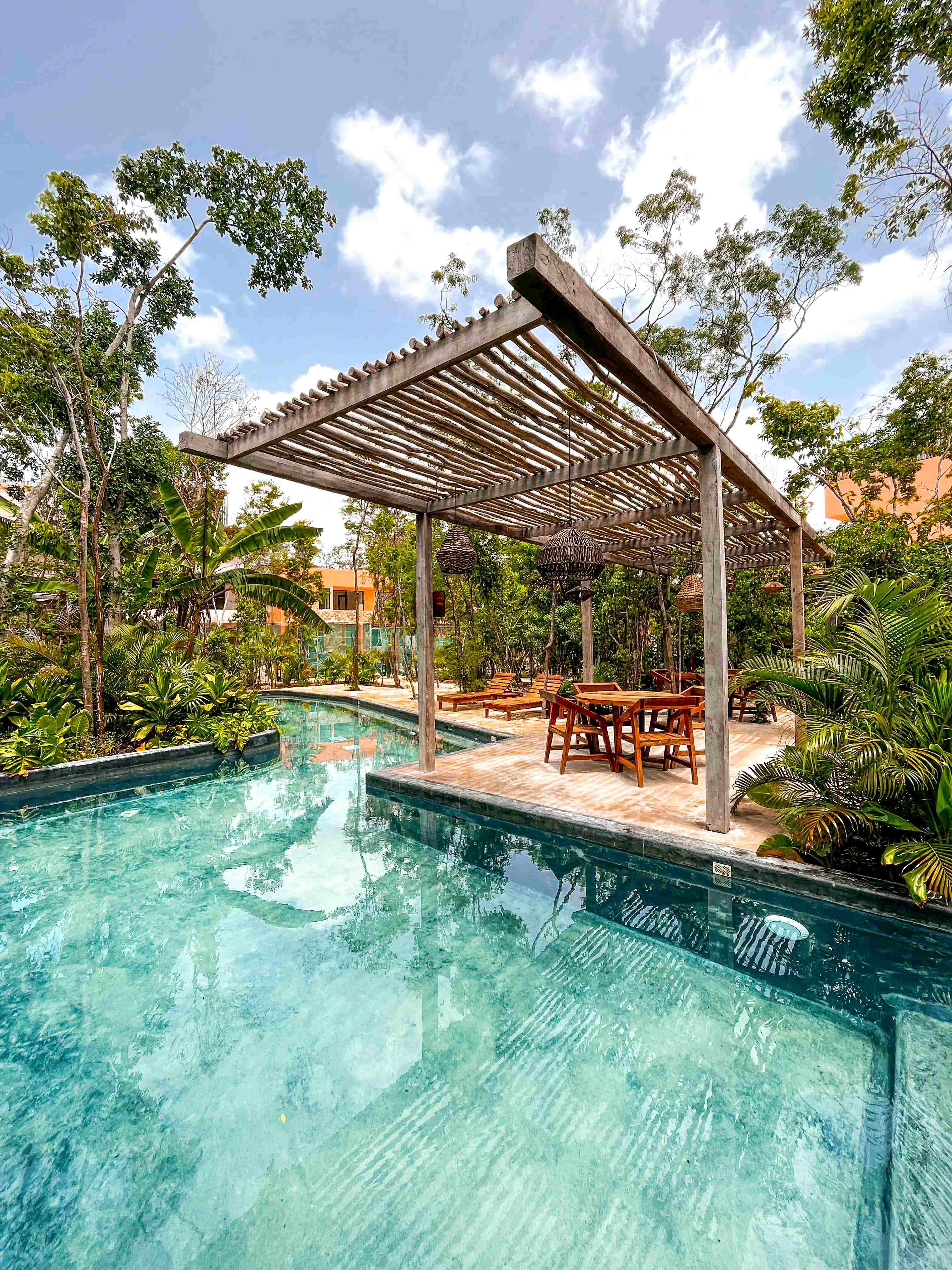 Residents of Aldea Savia enjoy a lifestyle centered around comfort, wellness, and connection with nature. The community features multiple swimming pools, including an infinity pool surrounded by lush greenery, two fully equipped gyms, yoga and hammock zones, a pet park, and family barbecue areas. Designed with security and peace of mind in mind, the gated complex offers 24-hour access control and on-site management. Homes range from studios and one-bedroom condos to spacious duplexes with rooftop terraces and three-bedroom houses, each with elegant finishes and large windows that blend indoor and outdoor living. With select phases already delivered and others nearing completion, Aldea Savia offers a rare opportunity to experience modern living in one of Tulum’s most sought-after areas.